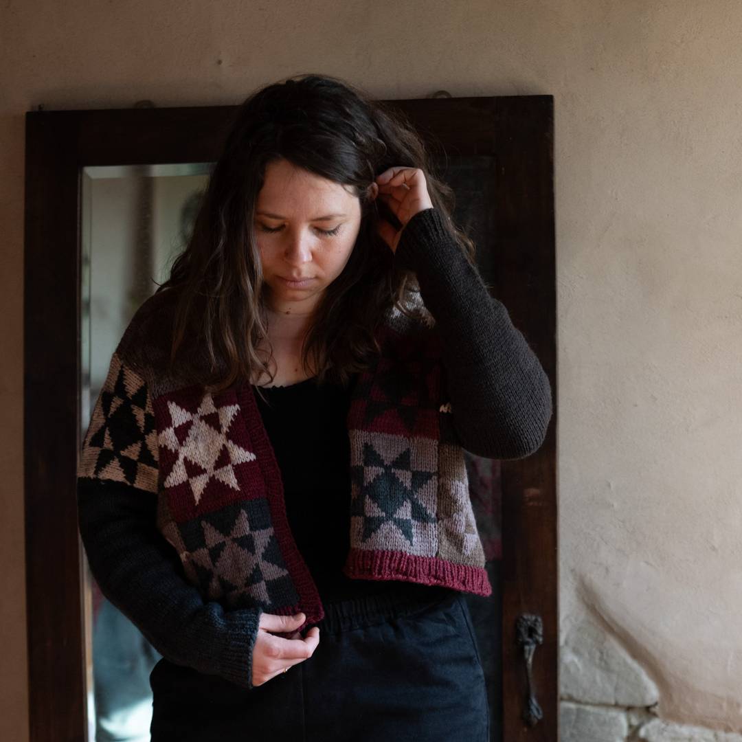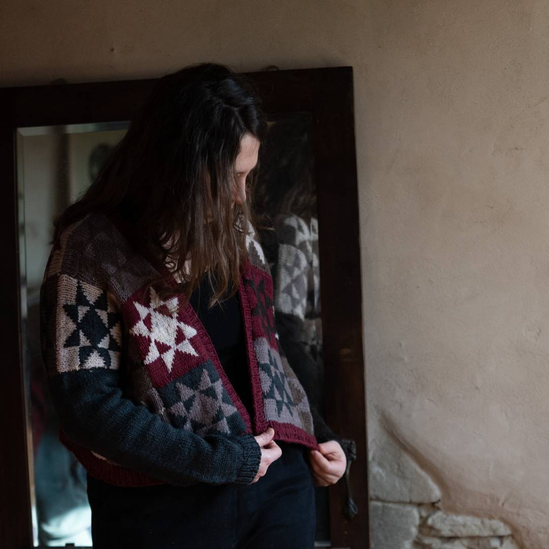 The cardigan by Katryn Seeburger is knitted using a block construction, combining different shades to build an harmonic effect once finished. All blocks are sewn with mattress stitch, that is quite a meditative thing too.