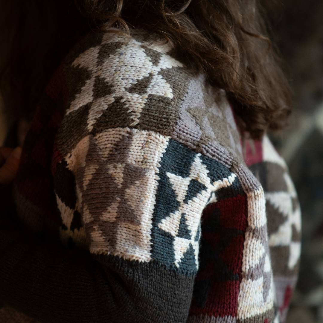 This pattern features weights per swatch and design step as well as instruction of how to track your yarn usage, so that you can make a plan to use your stash, remnants, and any of your special yarns. We planned which shades to us for sleeves and ribbing, and consequently knitted a number of blocks with those shades considering the estimated sufficient yarn left, it worked perfectly.