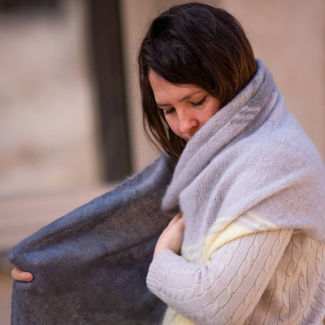 The pattern is a joy to knit: the stripes keep things flowing, and the lace corners add just the right amount of interest without ever feeling too fussy. The result is a generous wrap you can really wrap yourself in—light enough to float, big enough to make a statement.