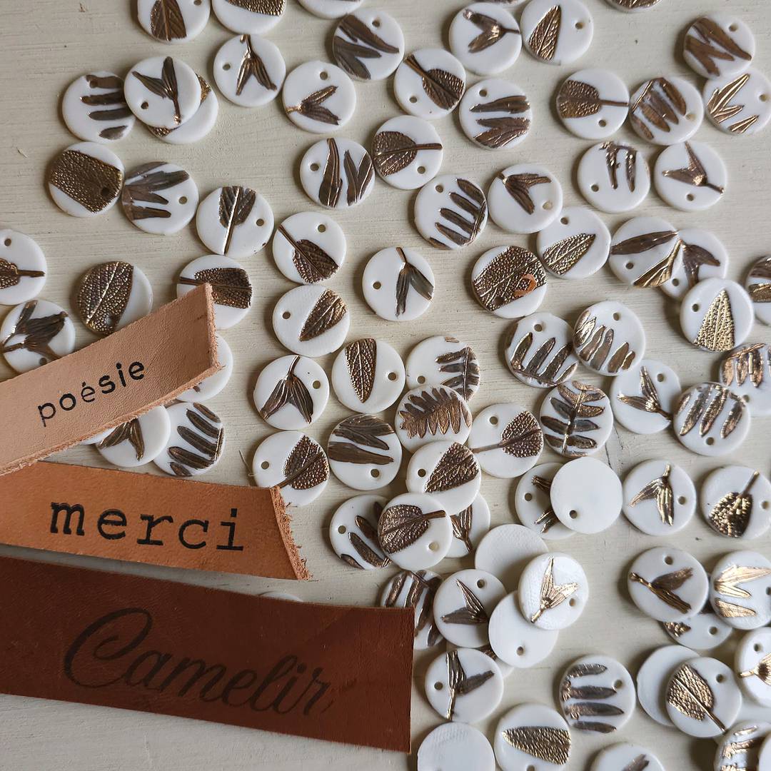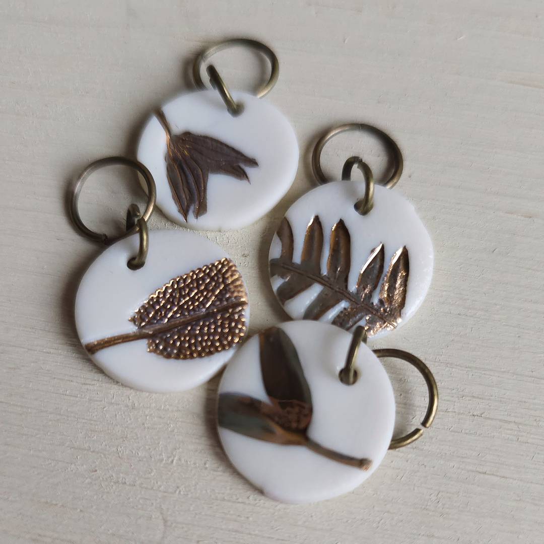 Our dear and talented Cecile of Atelier Camelir created these elegant stitchmarkers, made of porcelain that was engraved with herbs motives and then hand painted with a golden iridescet glaze.