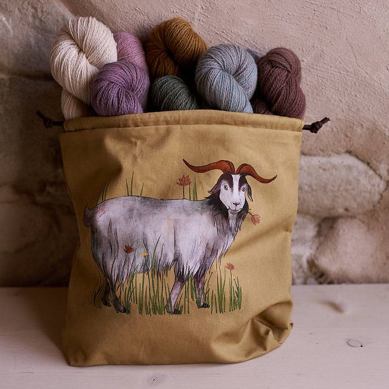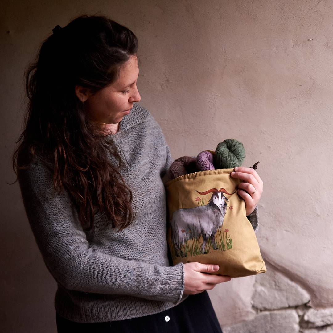 So we worked with Eva of The Blue Rabbit House to create a gorgeous project bag, that would portrait one of the main actors that actually made the yarn too, a cashmere goat of course!