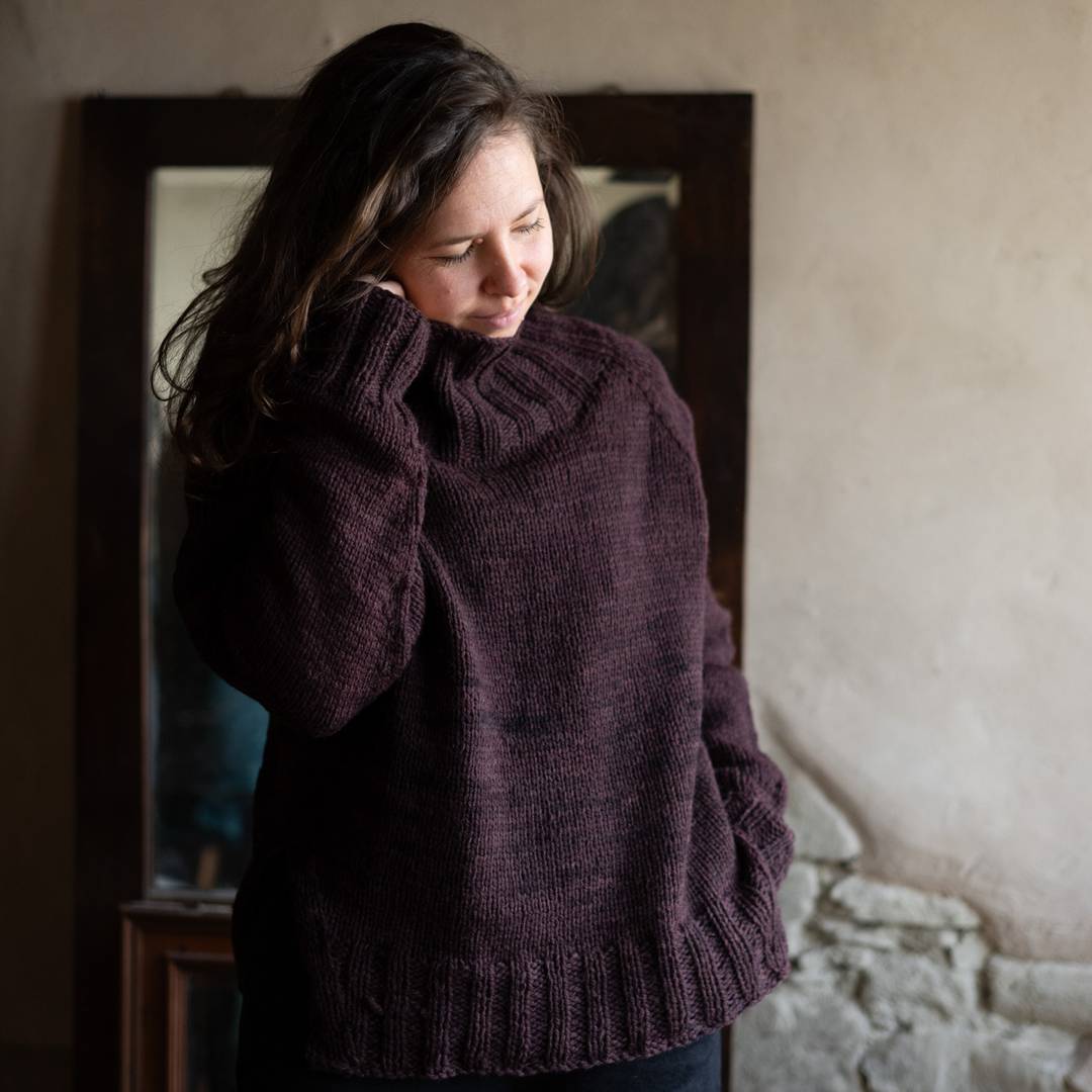 Infatti è un modello abbastanza corto, lavorato a maglia rasata e coste con collo alto, ampie aperture laterali e maniche lunghe. Le aperture laterali si restringono grazie a semplici diminuzioni, quindi è sempre facile muoversi con questo maglione indosso. Le maniche sono dritte e affusolate. Il maglione è lavorato top down e per ciò è facile allungare il corpo prima di lavorare gli spacchi, ma occorre prevedere una maggiore quantità di filato.