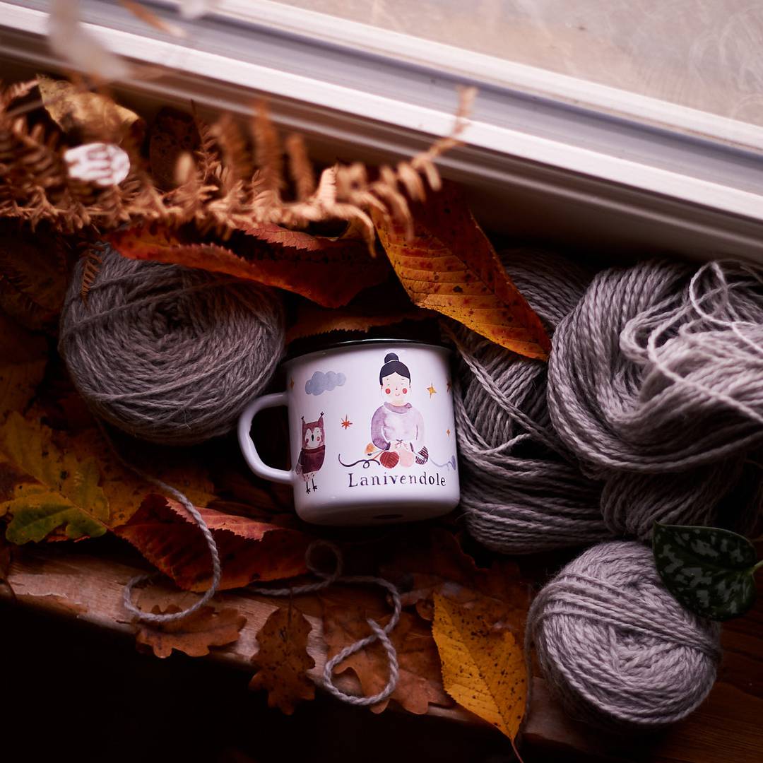 Le illustrazioni ad acquerello di Alice decorano tutta la tazza, evocando il nostro progetto nel mondo della maglia e dei filati.