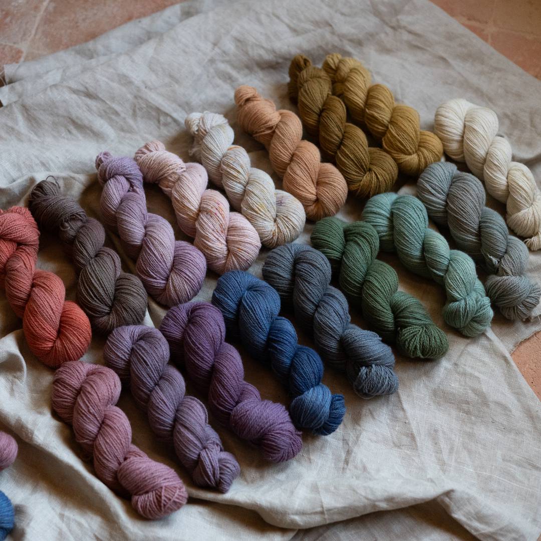 La palette tinta a mano riflette le tonalità delle terre in cui le fibre sono state coltivate e raccolte, tutti i nomi sono stati presi in seguito alle capre cashmere che hanno contribuito a realizzare questo filato con il loro prezioso vello.