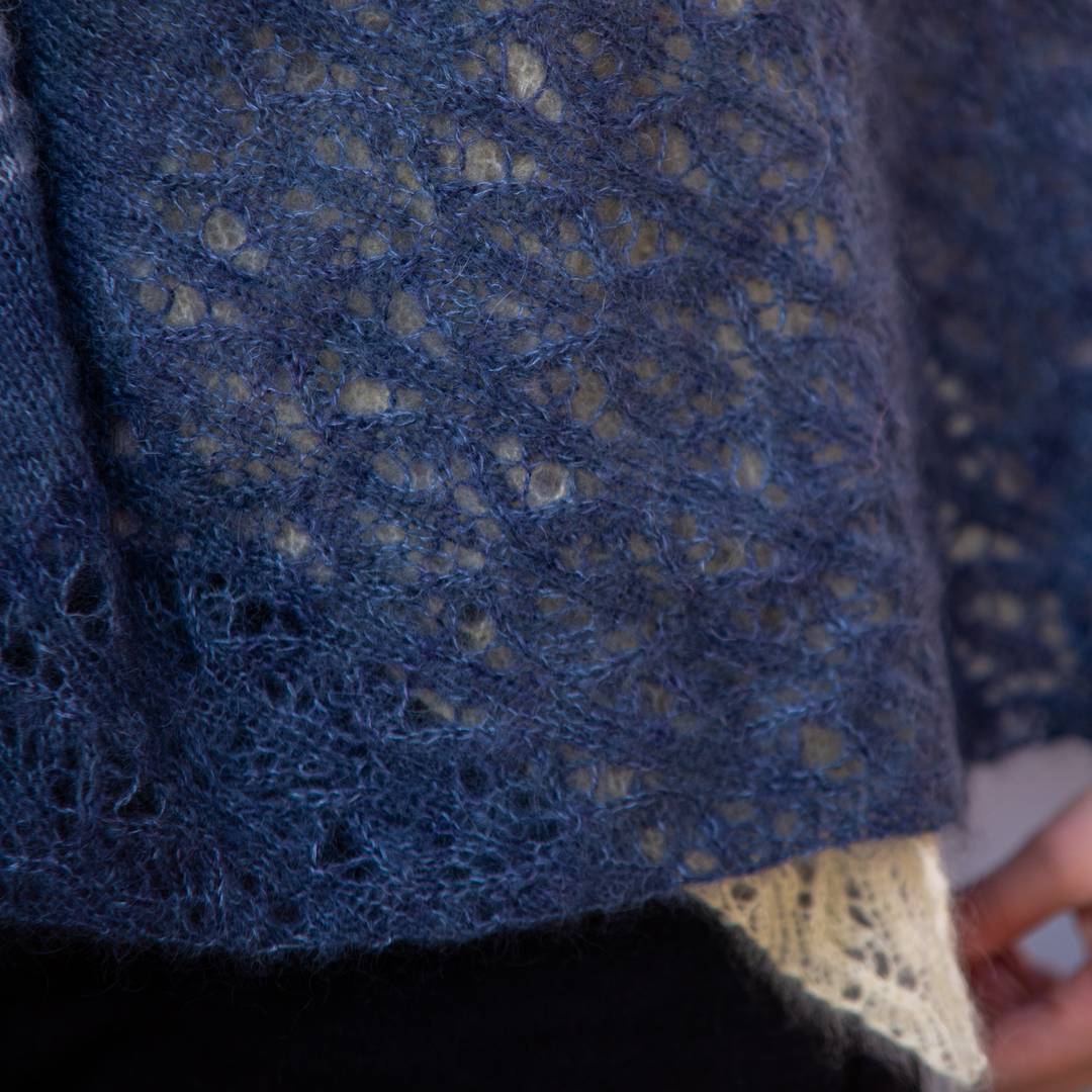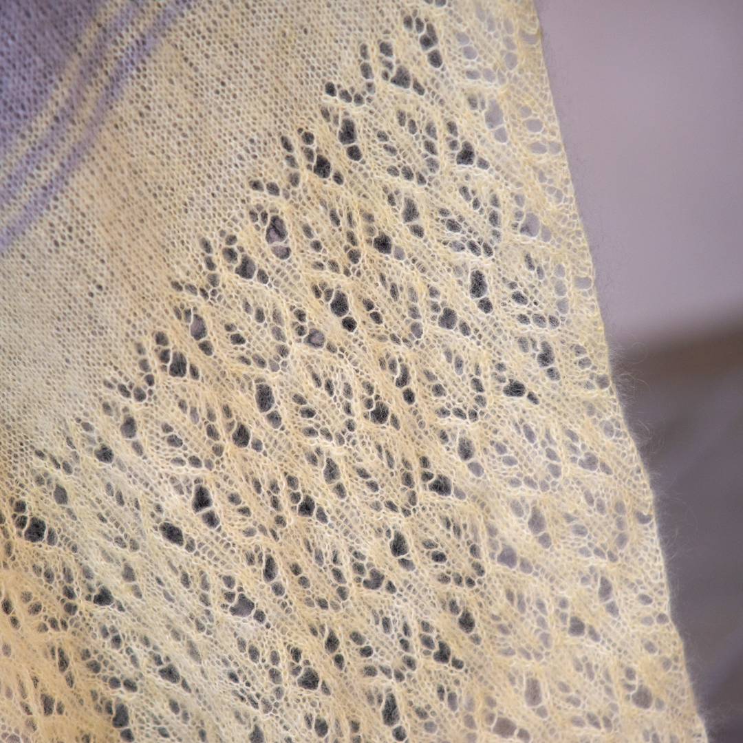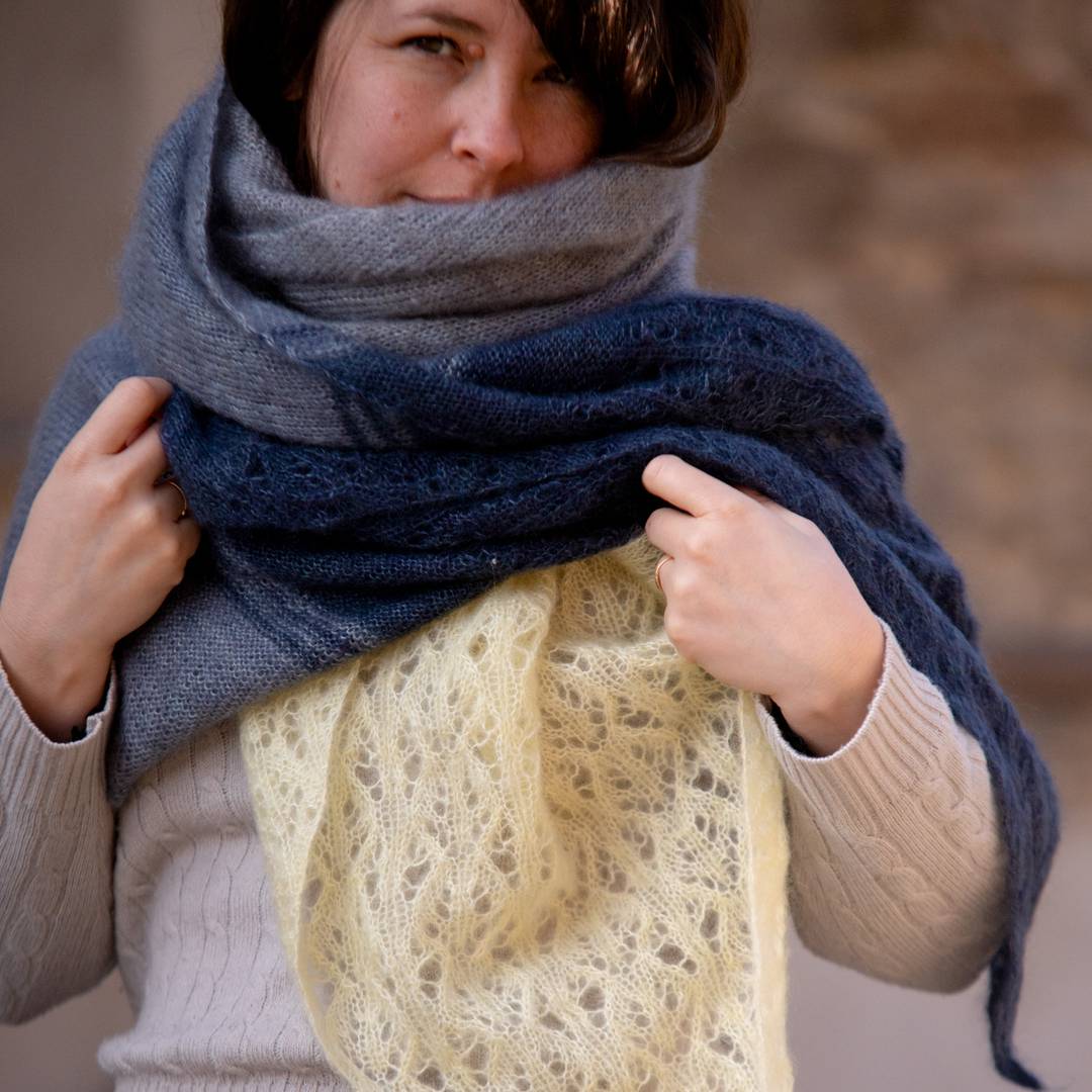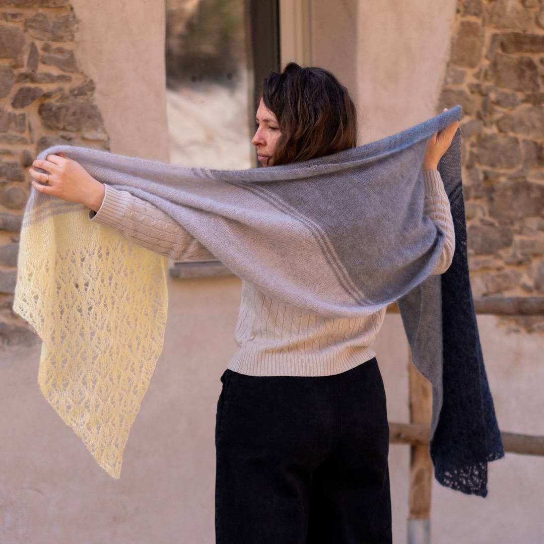 The pattern is a joy to knit: the stripes keep things flowing, and the lace corners add just the right amount of interest without ever feeling too fussy. The result is a generous wrap you can really wrap yourself in—light enough to float, big enough to make a statement.
