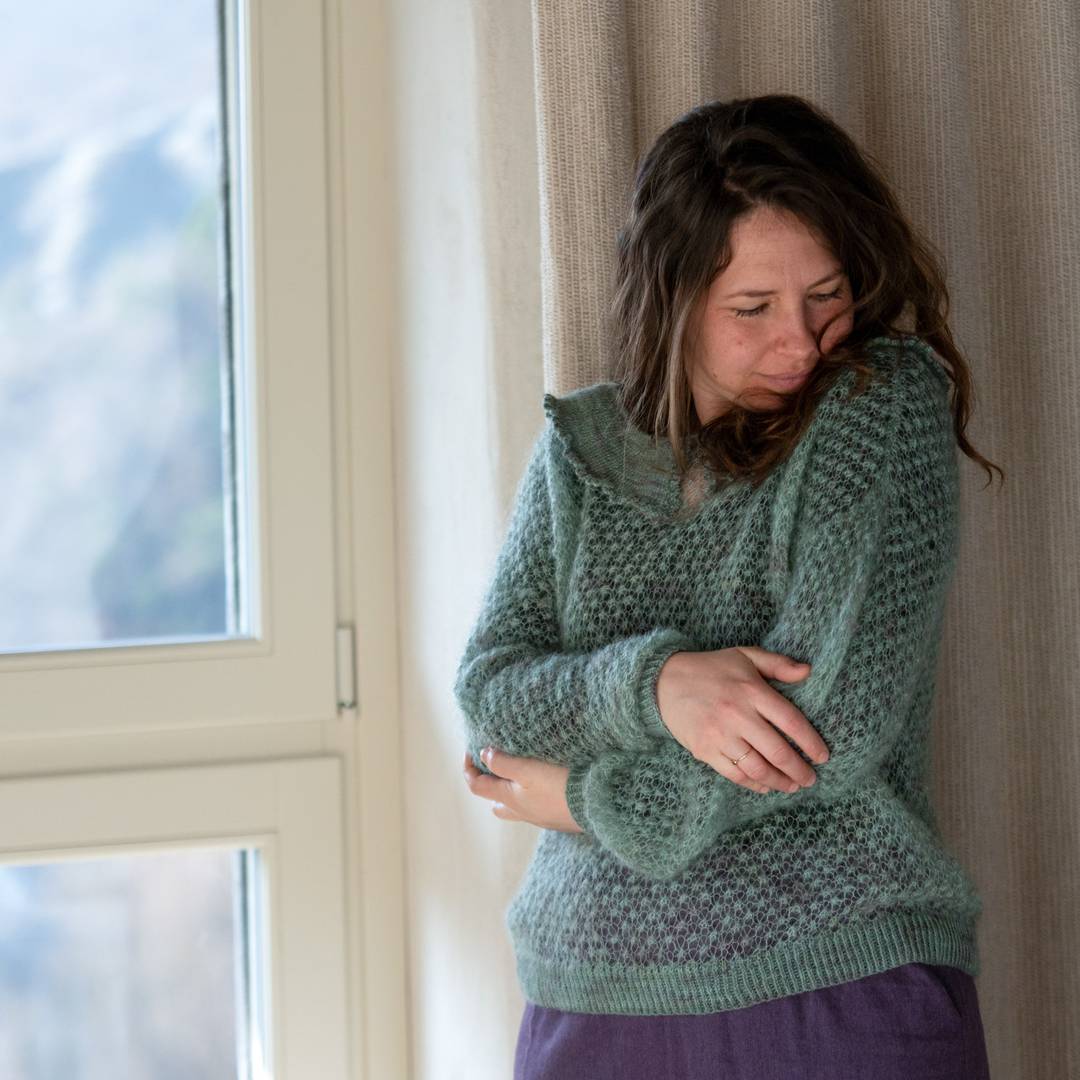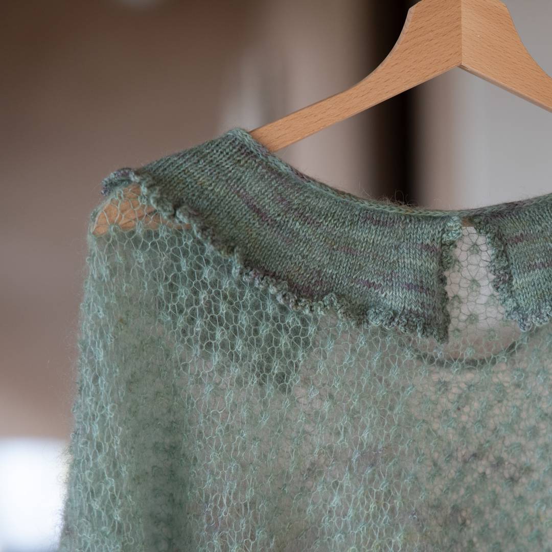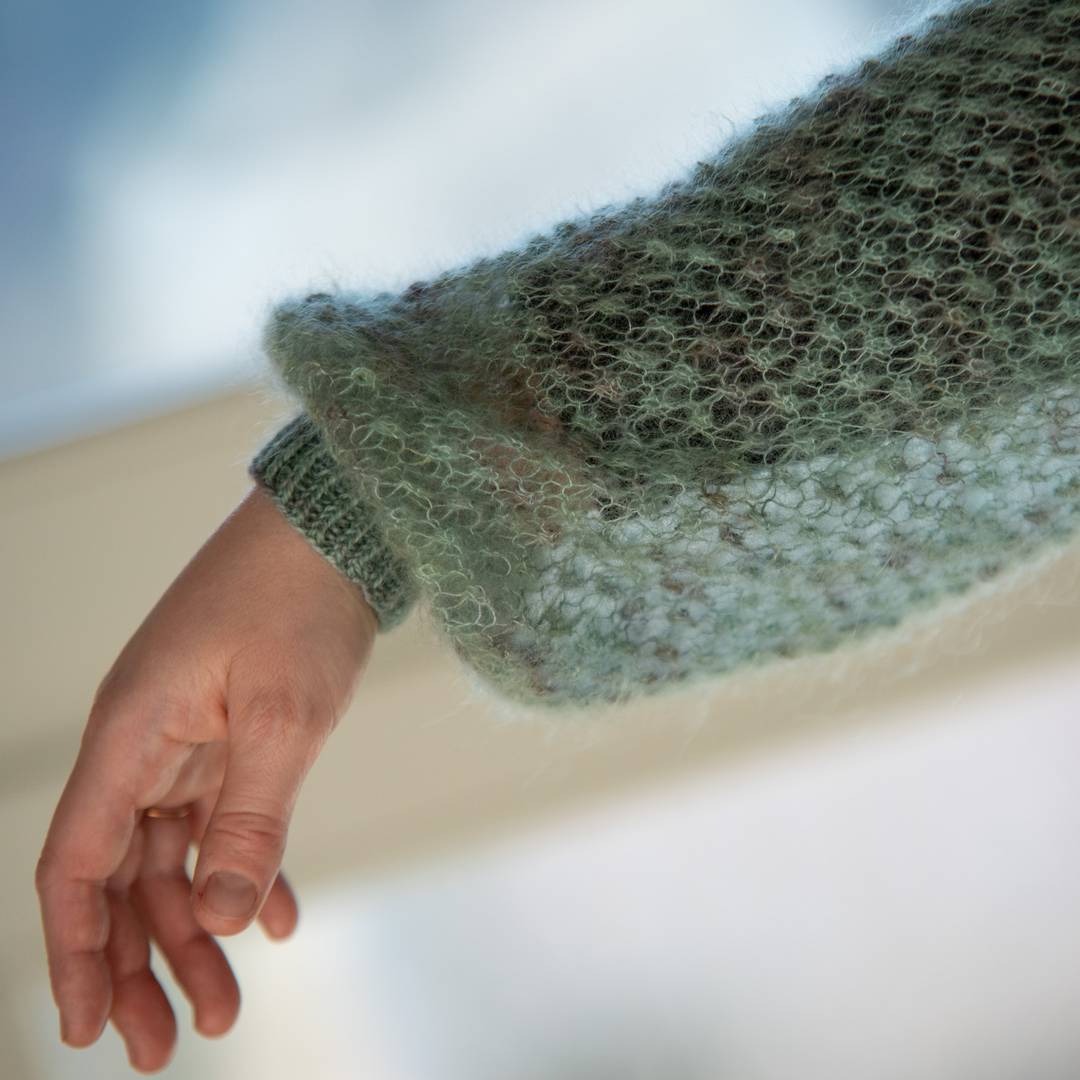 The collar, sleeve cuffs and bottom hem are worked in 1x1 twisted rib using a fingering weight yarn: this adds a contrasting element to the design, and gives structure to the garment.