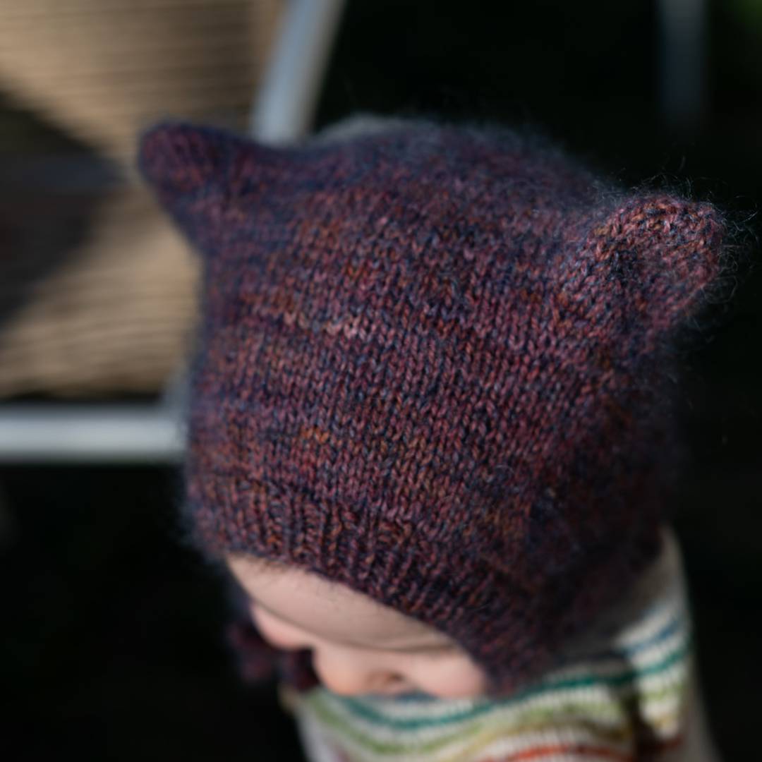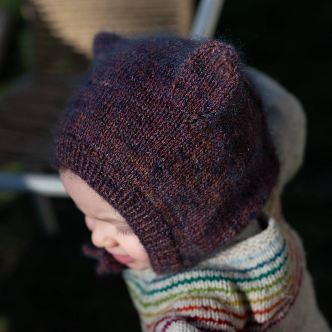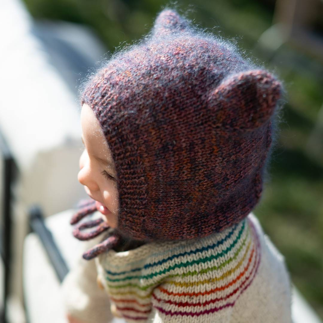 The bonnet is worked back and forth: you begin at the band, which you can make either in moss stitch or ribbed, and continue in stockinette stitch to the bear ears. The bear ears are shaped at the same time as you work to the crown. You then place the bear ear stitches on hold, and shape the back of the bonnet to the neck, by working short rows and decreases. The bonnet has an I-cord edge and I-cord strings to tie it up.