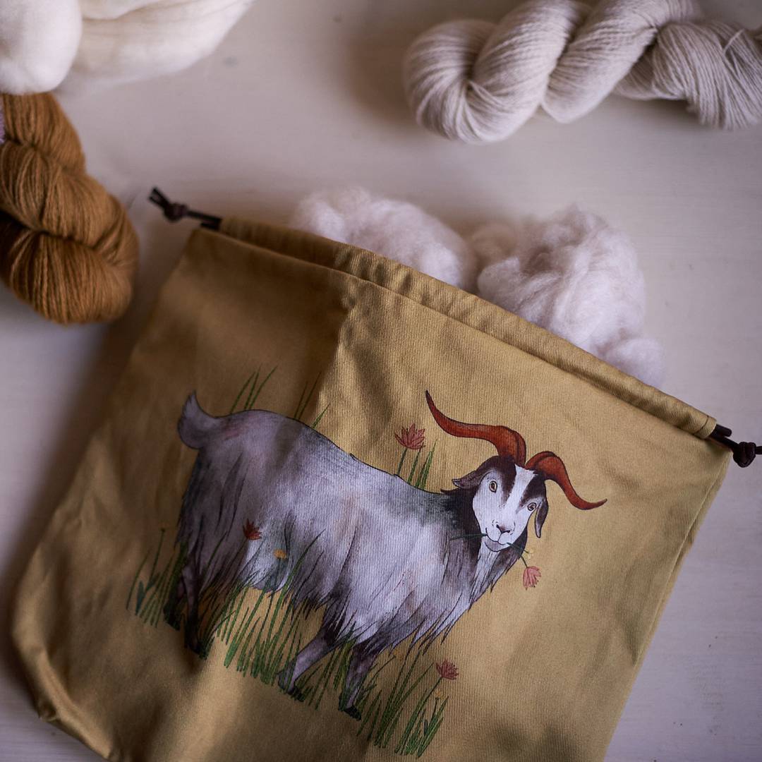 Abbiamo quindi collaborato con Eva di The Blue Rabbit House per creare una splendida sacca da lavoro, che ritraesse anche uno degli attori principali che hanno realizzato il filato, naturalmente una capra di cashmere!